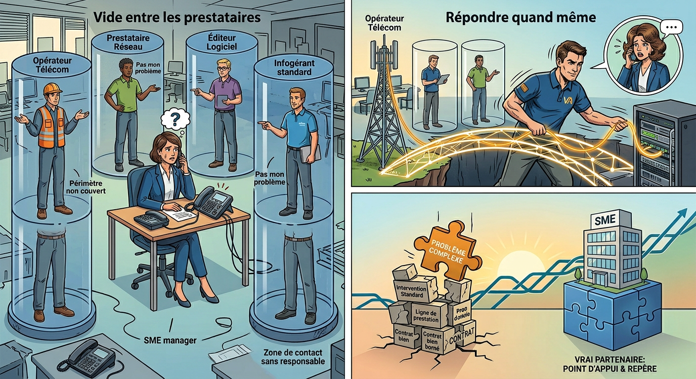 Dans de nombreuses PME les pannes ne rentrent jamais proprement dans les cases prévues. Sur le papier, chacun a son périmètre. Dans la réalité, quand quelque chose tombe, les frontières entre prestataires ne servent plus à grand-chose. C’est souvent là que le client se retrouve seul.